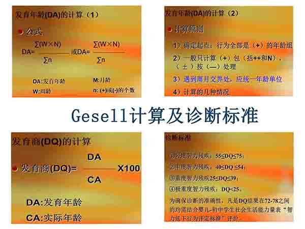 格賽爾(Gesell)智能診斷法適用于嬰幼兒。這種方法 從動(dòng)作能、應(yīng)物能、言語能及應(yīng)人能4個(gè)方面進(jìn)行檢查,并把4周、16周、28周、40周、52周、18個(gè)月、24個(gè)月、36個(gè)月作為8個(gè)“樞紐年齡”,即 在這些階段顯示出特殊飛躍進(jìn)展。所測(cè)得的結(jié)果,以發(fā)育商數(shù)(DQ)來表示。