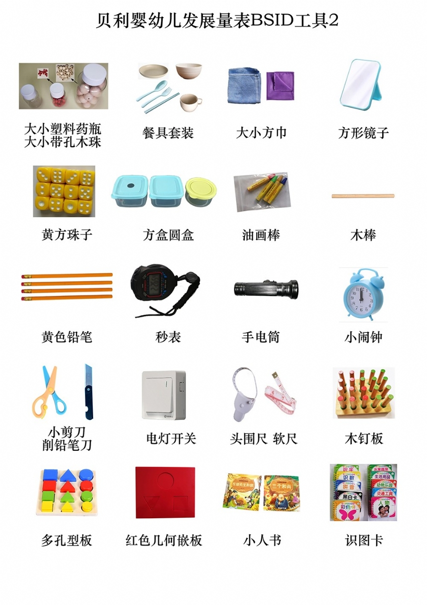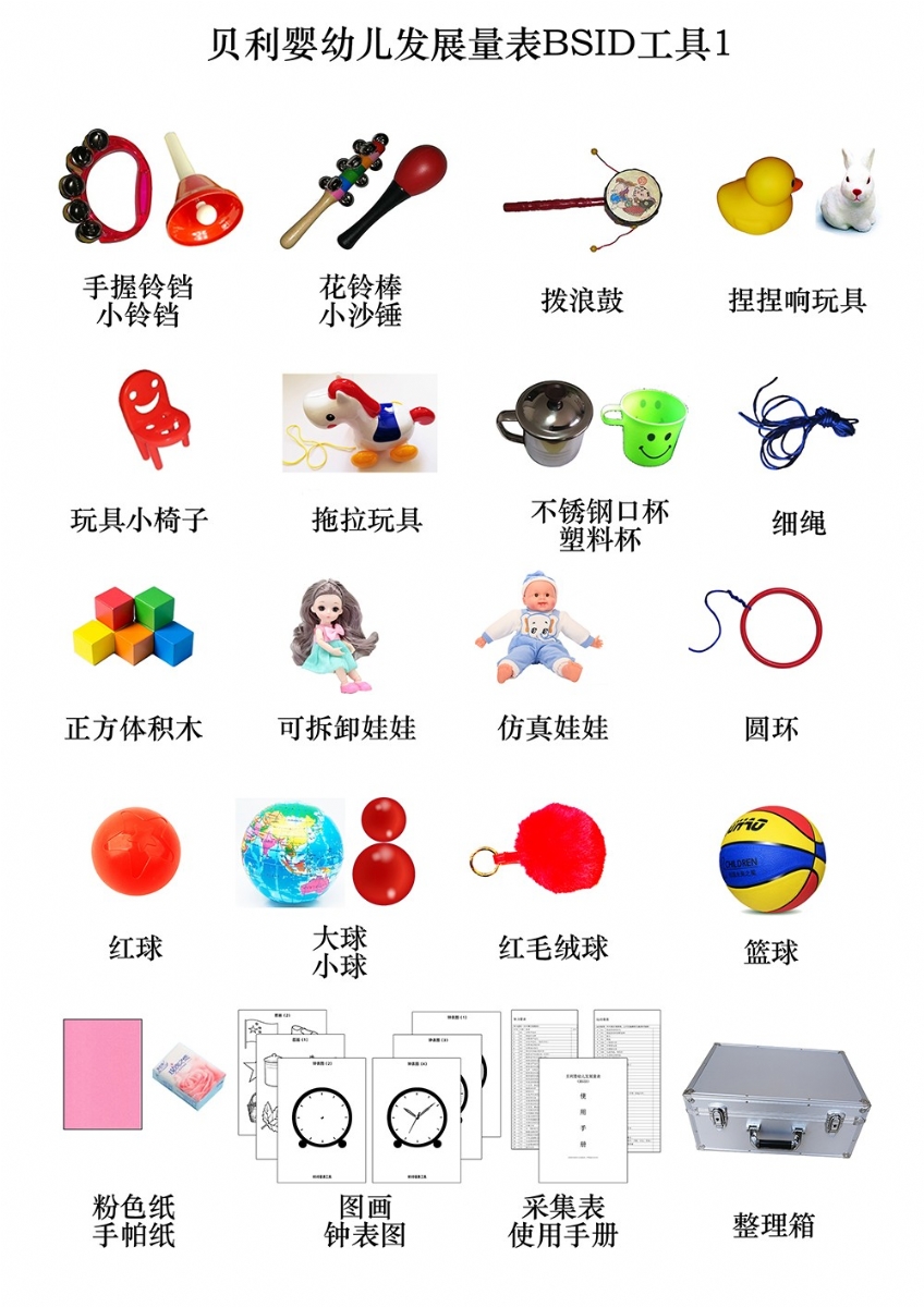 手握鈴鐺、小鈴鐺、花鈴棒、撥浪鼓、小沙錘、捏捏響玩具、玩具小椅子、拖拉玩具(帶線(xiàn))、小正方體積木(紅12個(gè),黃藍(lán)綠各2塊)、可拆卸娃娃、布娃娃、圓環(huán)、紅球、大球、紅毛絨球、籃球、紅色小球、細(xì)繩、不銹鋼口杯、塑料杯、大號(hào)塑料藥瓶、小號(hào)塑料藥瓶、餐具套裝、大小方巾、方形鏡子、大木珠(帶孔)、小木珠(帶孔、)黃方珠子、塑料方盒、塑料圓盒、油畫(huà)棒、指揮棒、黃色鉛筆、秒表、手電筒、小鬧鐘、電燈開(kāi)關(guān)、頭圍尺、軟尺、木釘板、多孔型板(含圓形、方形、三角形各4塊)、幾何嵌板(含圓、三角、方形,厚8mm)、小人書(shū)識(shí)圖卡(果蔬、人物、動(dòng)物、交通等)、粉色卡紙、手帕紙、鐘表圖1234、圖畫(huà)12(BSID)、BSID采集表、BSID使用手冊(cè)、整理箱等。